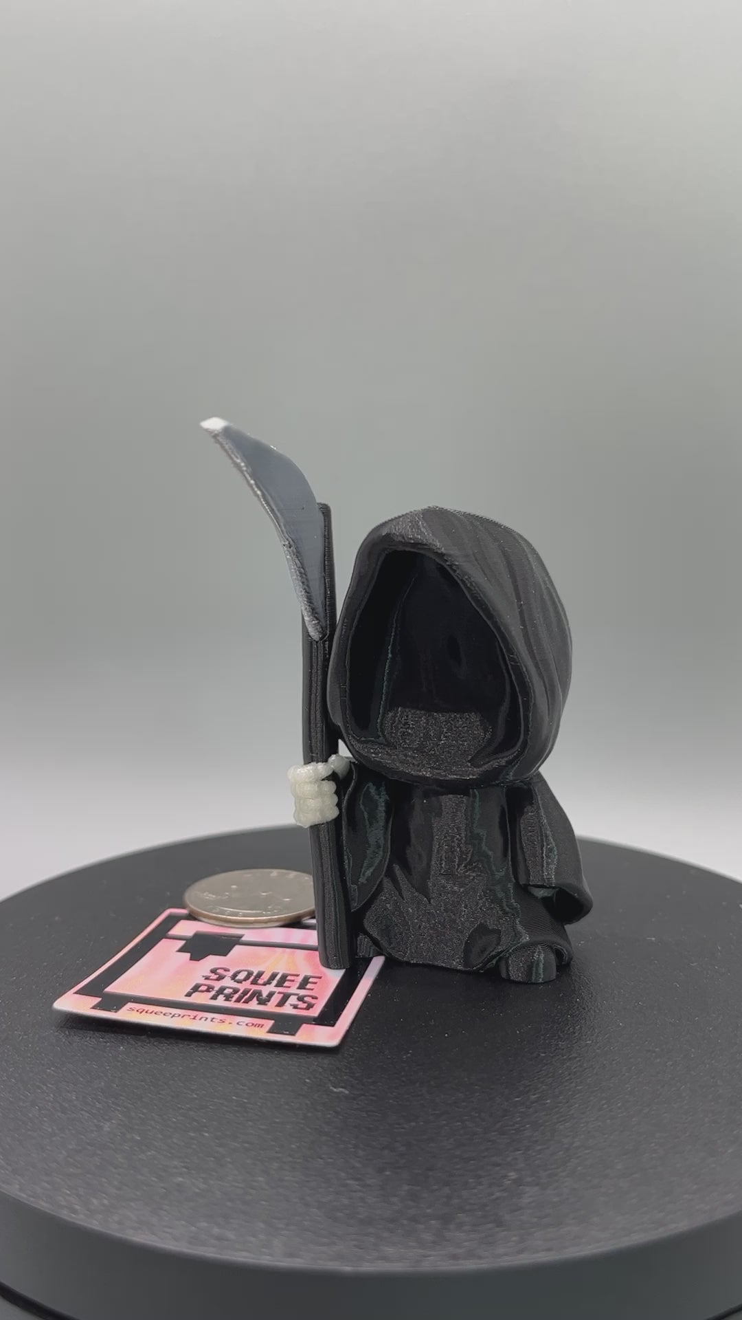 Introducing our 3D Printed Grim Reaper, a mesmerizing and eerie addition to your collection. This faceless, hooded figure stands at approximately 3 inches tall and is printed in striking black and silver PLA, with an intriguing twist - the skeletal hands beneath the cloak glow in the dark.