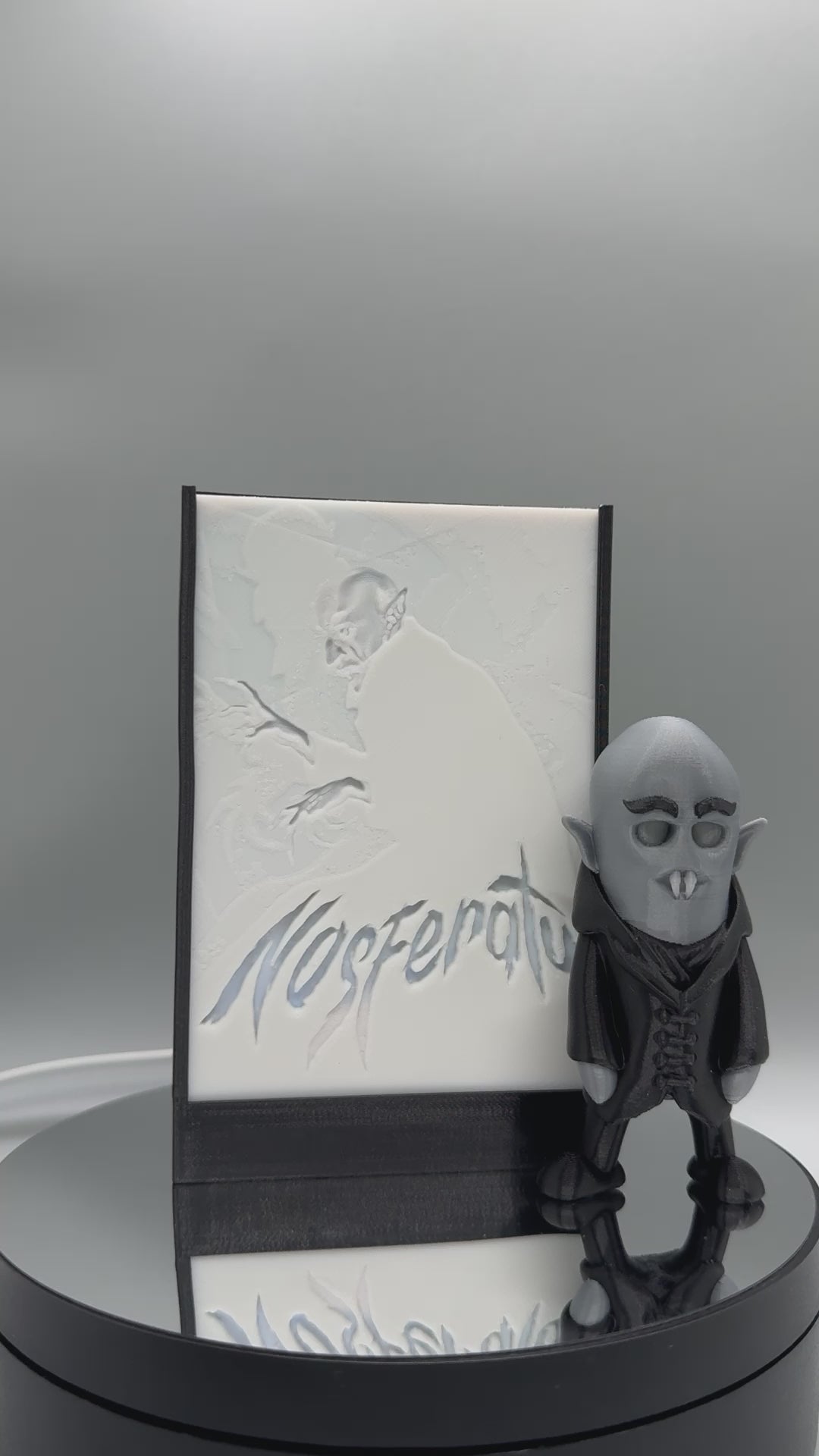 Standing at approximately 4 inches tall, this Nosferatu comes with a special treat—a full-color 3D Printed Lithophane Mini Movie Poster Bundle. Illuminate your space with eerie charm as the intricate details cast shadows and bring the legendary vampire to life.